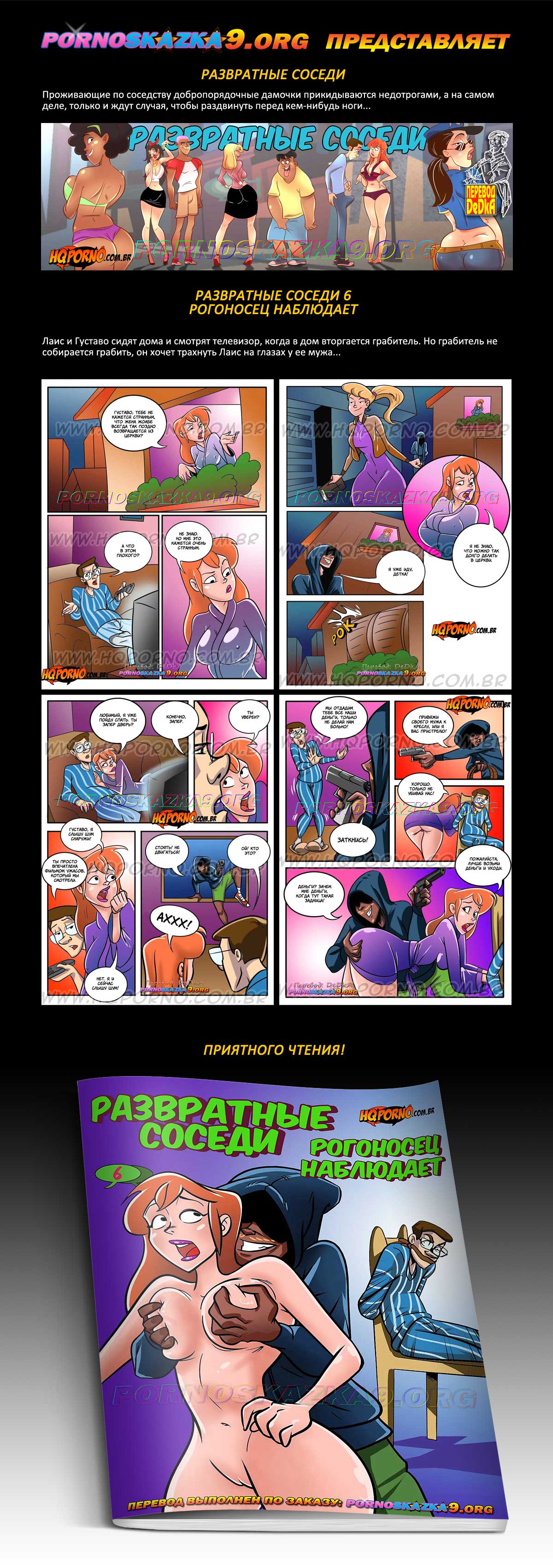 Порно комикс «Развратные соседи. Часть 6. Рогоносец наблюдает». Лаис и Густаво сидят дома и смотрят телевизор, когда в дом вторгается грабитель. Но грабитель не собирается грабить, он хочет трахнуть Лаис на глазах у ее мужа…
